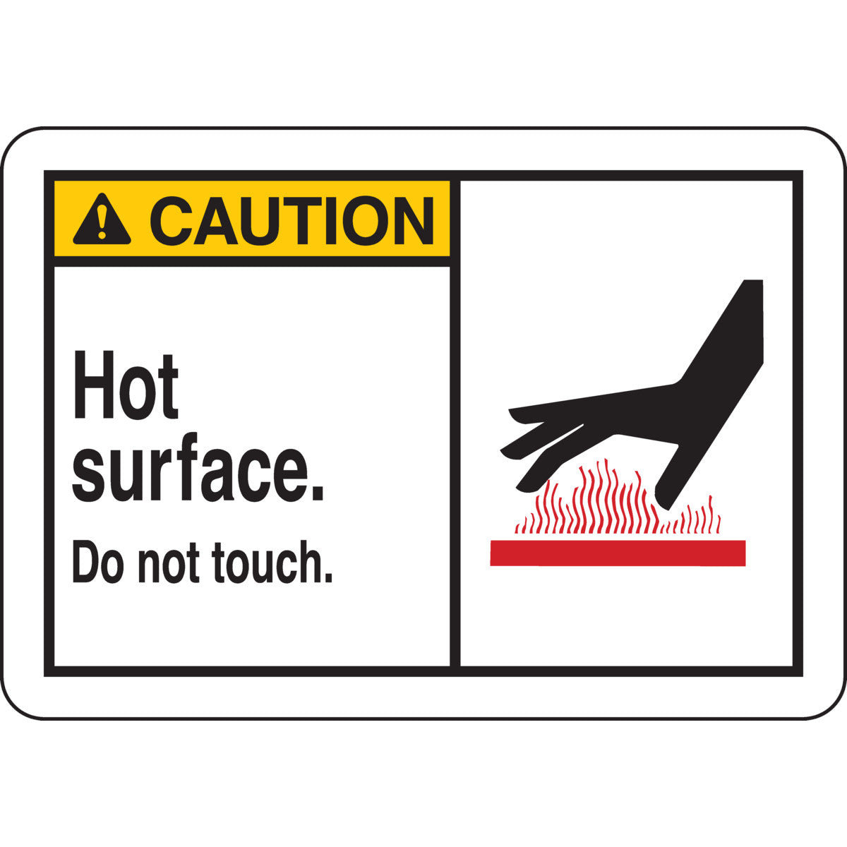 CAUTION Hot Surface. Do Not Touch. Sign, 7" H x 10" W x 0.06" D, Polystyrene, Black/Red on Yellow