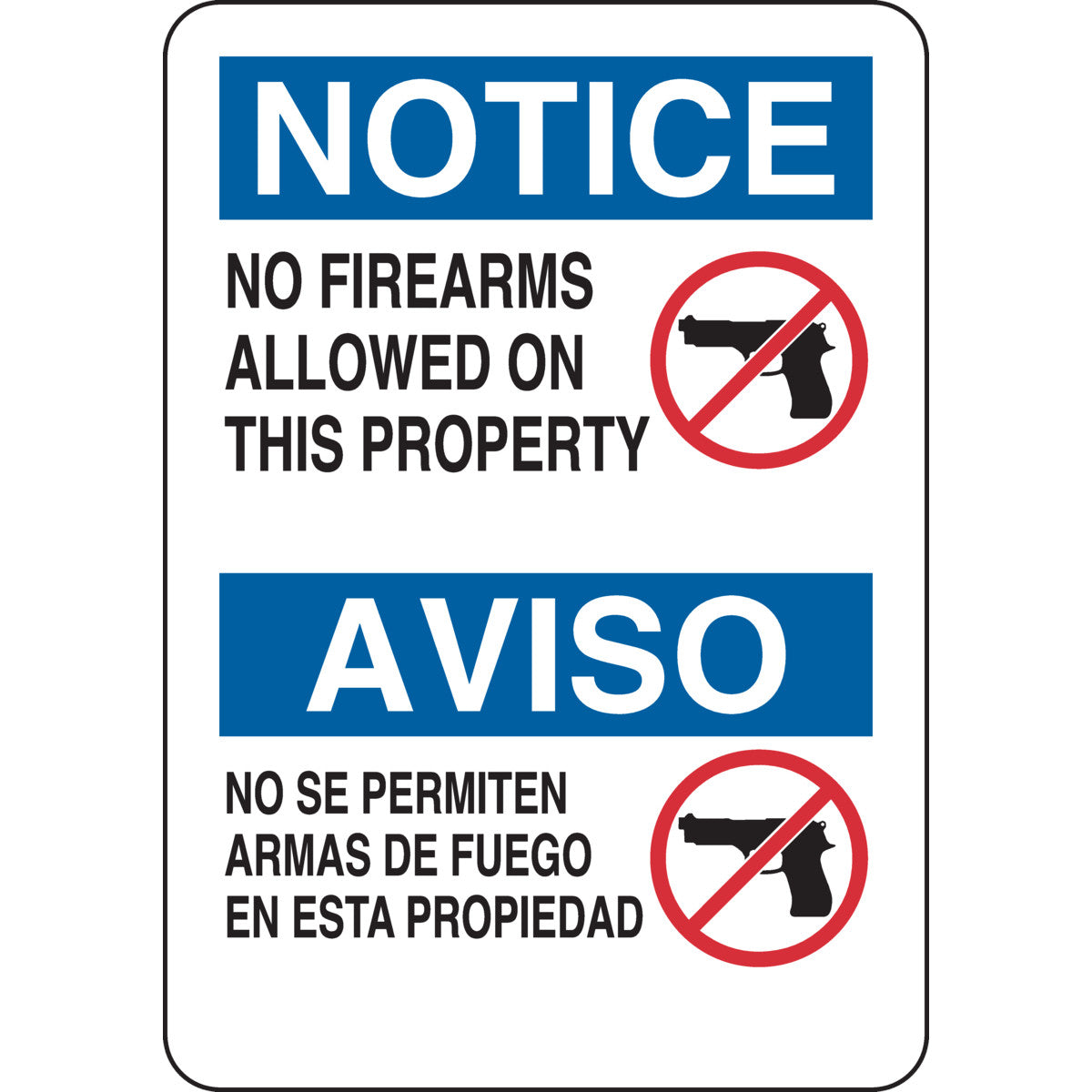Bilingual NOTICE No Firearms Allowed On This Property Sign, 10" H x 7" W x 0.035" D, Aluminum