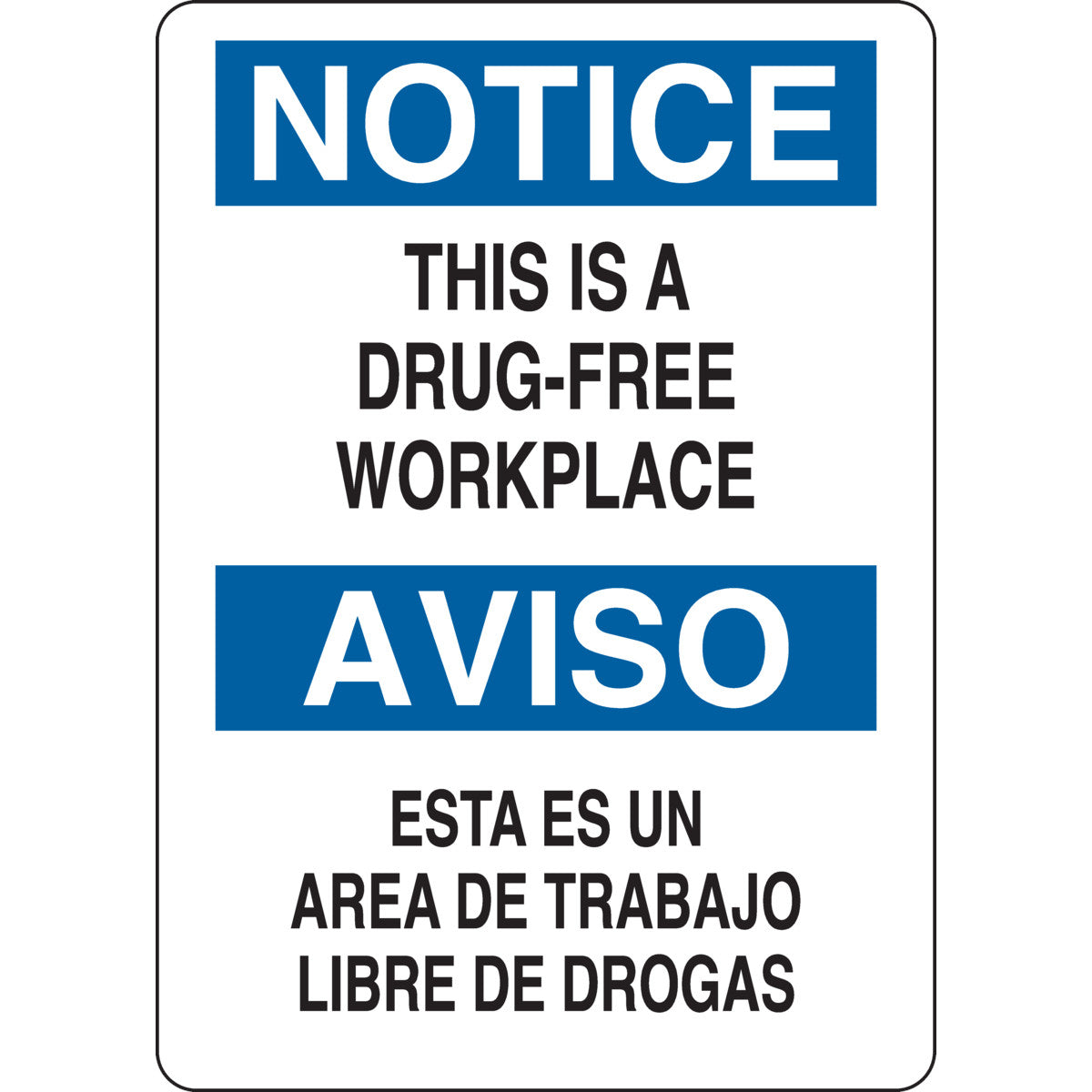 Bilingual NOTICE This Is A Drug-Free Workplace Sign, 14" H x 10" W x 0.035" D, Aluminum