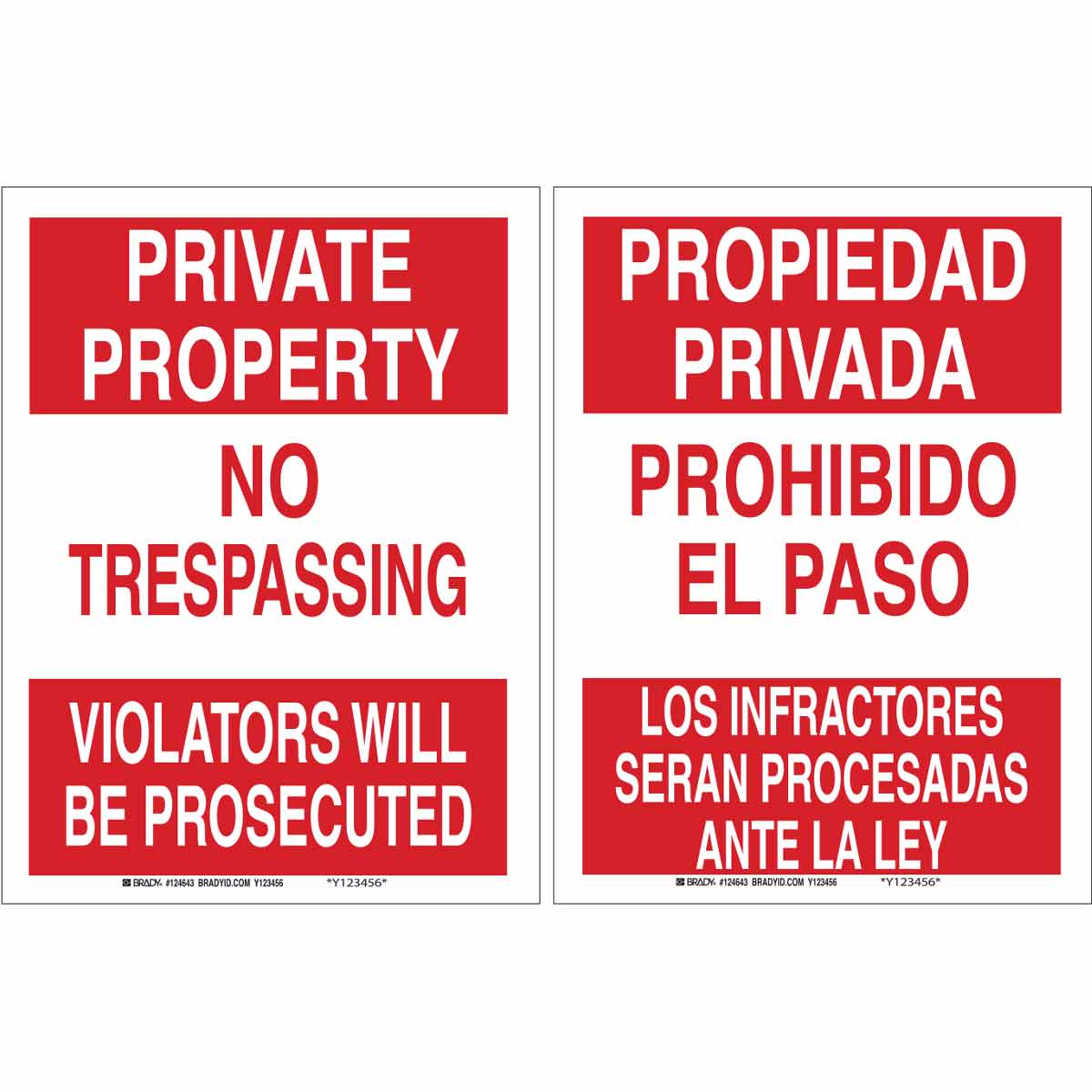 Bilingual PRIVATE PROPERTY No Trespassing Violators Will Be Prosecuted Sign, 18" H x 24" W x 0.035" D, Aluminum
